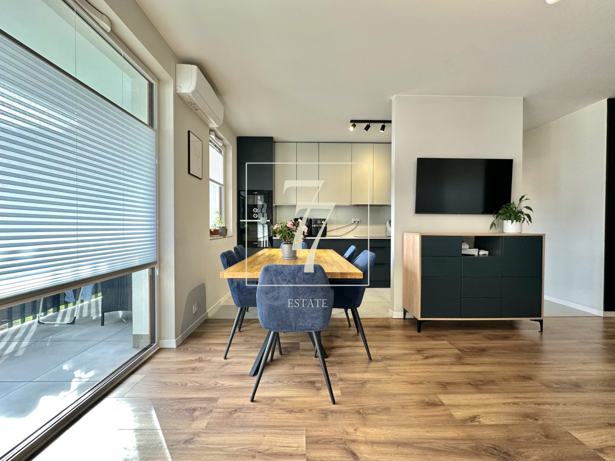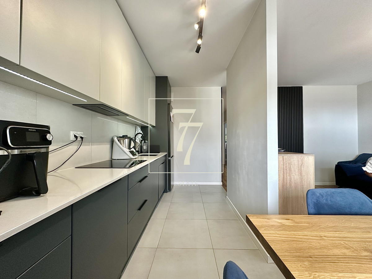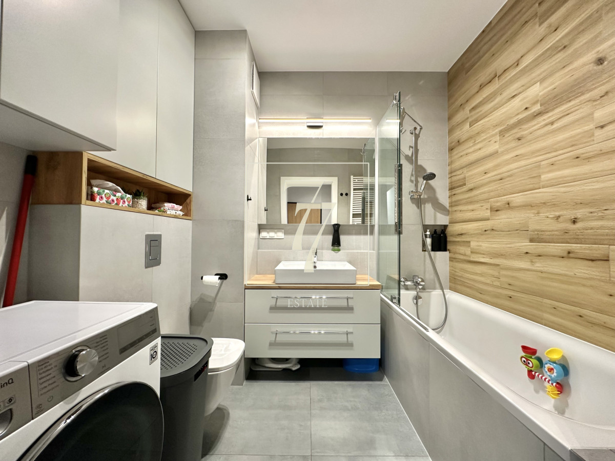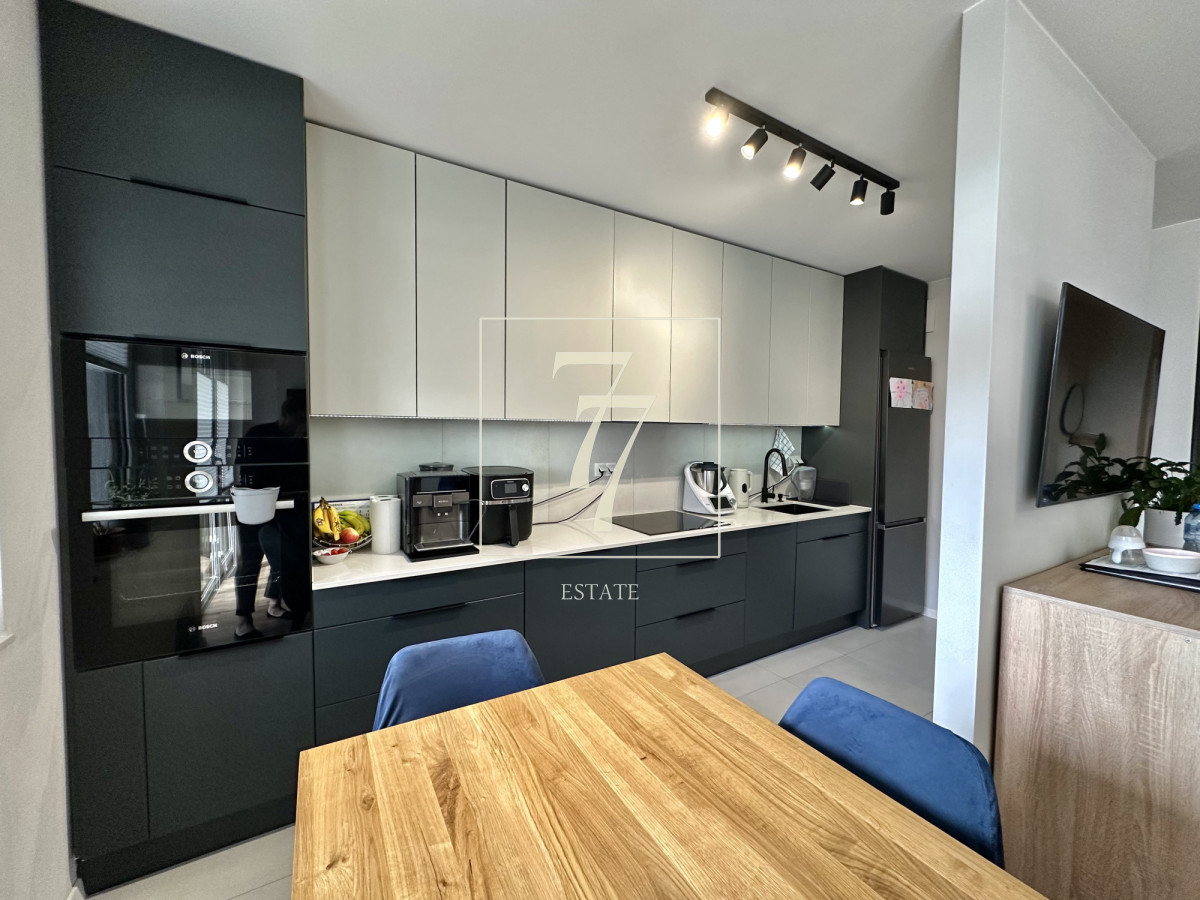Cała zabudowa w mieszkaniu została zrobiona na wymiar przez stolarza. Zamontowano wysokiej jakości armaturę oraz kamienne blaty. W salonie zainstalowana została klimatyzacja. Nieruchomość sprzedawana jest wraz z pełnym umeblowaniem i nie wymaga żadnych bieżących napraw.
